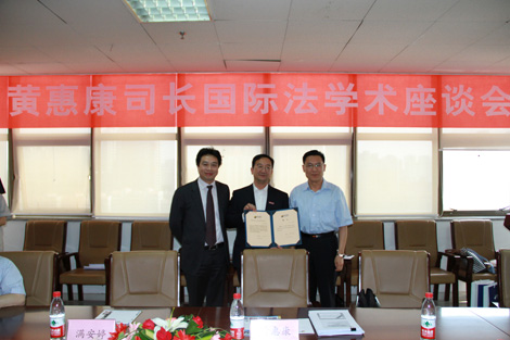 2012年5月26日,外交部条约法律司黄惠康司长“郑和研究员”授聘仪式暨国际法学术座谈会在法学院910会议室举行。乐动网页版党委常务副书记王小力教授、法学院党总支书记彭沪生老师、对外经济贸易大学石静霞教授以及丝绸之路国际法与比较法研究所骨干教师和学生代表参加了授聘仪式和座谈会。会议由法学院院长兼丝绸之路国际法与比较法研究所所长单文华教授主持。