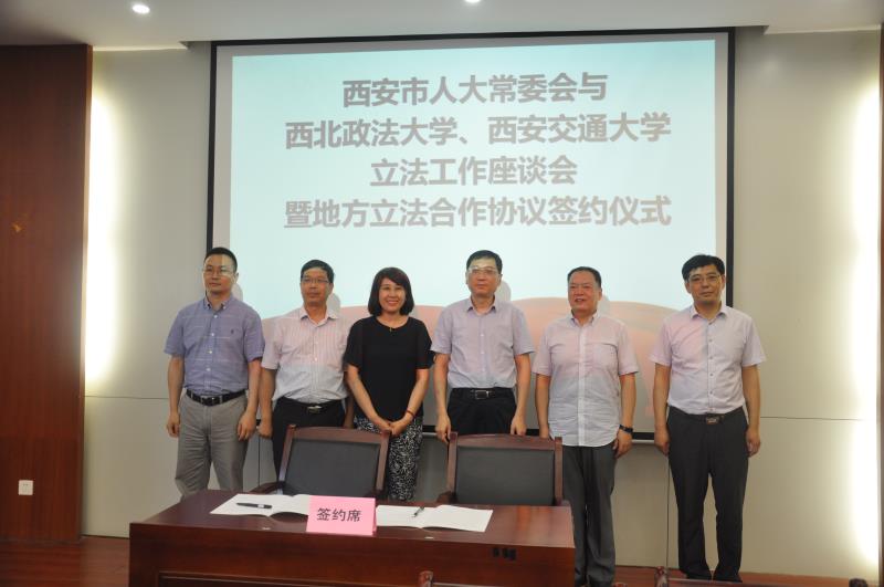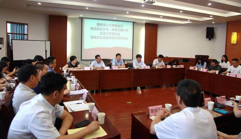 为深入贯彻落实党的十九大精神,推进科学立法、民主立法、依法立法,进一步提高立法质量,发挥高校专业优势,实现地方立法实践工作和法学教育研究的深度融合、相互促进、共同提升,助推法治西安建设,西安市人大常委会与西北政法大学、乐动网页版立法工作座谈会暨地方立法合作协议签约仪式”于6月20日上午在西北政法大学雁塔校区研究生综合举行。西安市市委组织部常务副部长、人大常委会副主任薛振虎,市人大法制委主任委员、常委会法工委主任牛犁和市人大常委会法工委其他领导,西北政法大学校长杨宗科,乐动网页版人文社科处处长贾毅华,乐动网页版立法与党内法规研究中心主任王保民和部分师生代表、西北政法大学立法研究所所长朱继萍和部分师生代表等参加了会议。