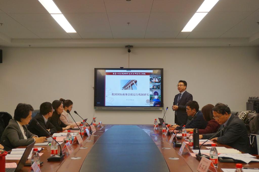 最高人民法院督察局局长、第六巡回法庭分党组副书记、副庭长何莉,最高人民法院民事审判第四庭副庭长沈红雨,清华大学法学院教授、最高人民法院国际商事专家委员会专家委员、世界贸易组织上诉机构前主席张月姣,中国社会科学院国际法研究所教授、最高人民法院国际商事专家委员会专家委员刘敬东,最高人民法院国际商事法庭协调指导办公室副主任龙飞,最高人民法院第六巡回法庭综合办主任马渊杰,陕西省高级人民法院民事审判第三庭庭长王建敏,最高人民法院法官孙雅婷出席开题报告会。课题负责人、法学院院长、最高人民法院国际商事专家委员会专家委员单文华作课题开题汇报。