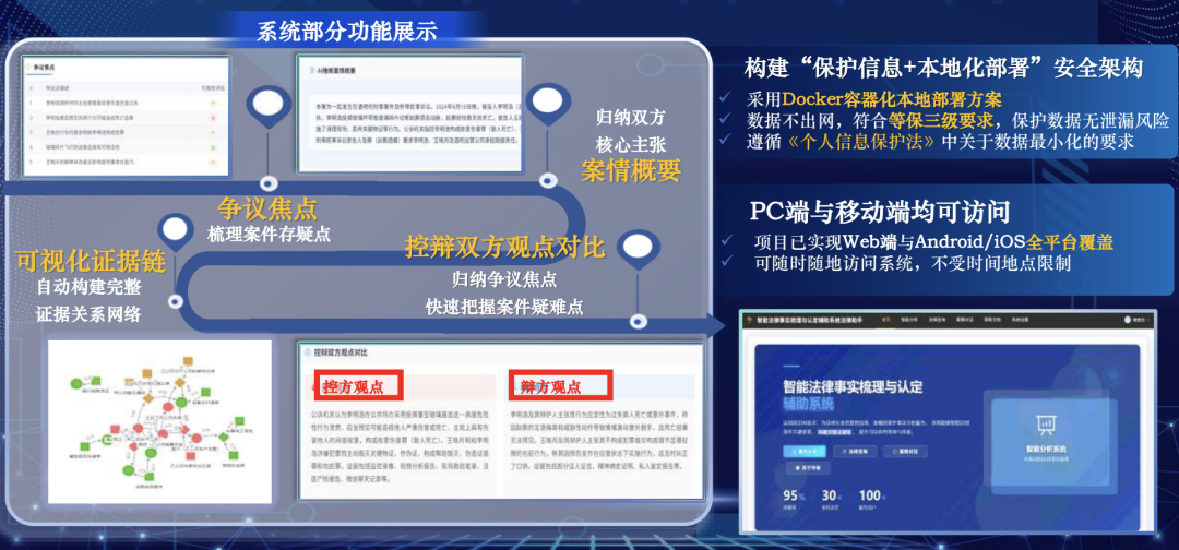 该项目充分体现了“经管法+理工”的跨学科交叉特色。团队选用了 DeepSeek-R1 开源模型为基础,通过 LoRA 参数微调技术,赋予模型精准识别法律术语及逻辑推理的能力。系统创新性地实现了“可视化证据链自动构建”,能够辅助法官快速梳理案情、归纳争议焦点,并采用 Docker 容器化本地部署方案,严格保障司法数据安全。该系统成为法官的智能助手,在提升审判效率的同时,筑牢司法严谨性的根基。