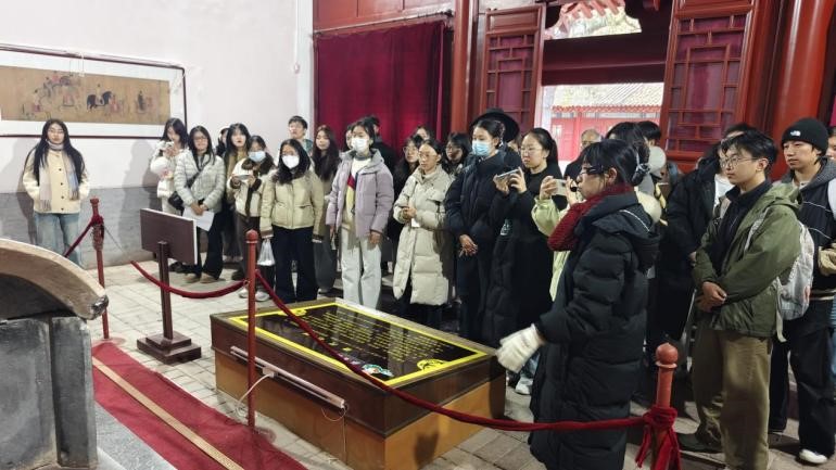 天气清寒,晨光初现,迎着凛冽的北风,在一片热闹的氛围中,师生们走进了本次行程的第一站——药王山。药王山因药王孙思邈长期隐居于此而得名,其中有药王大殿、摩崖石刻等诸多不可移动文物和姚伯多造像碑、魏文朗造像碑等可移动文物,其历史、艺术和科学价值突出,受到各级文物保护单位的重视。